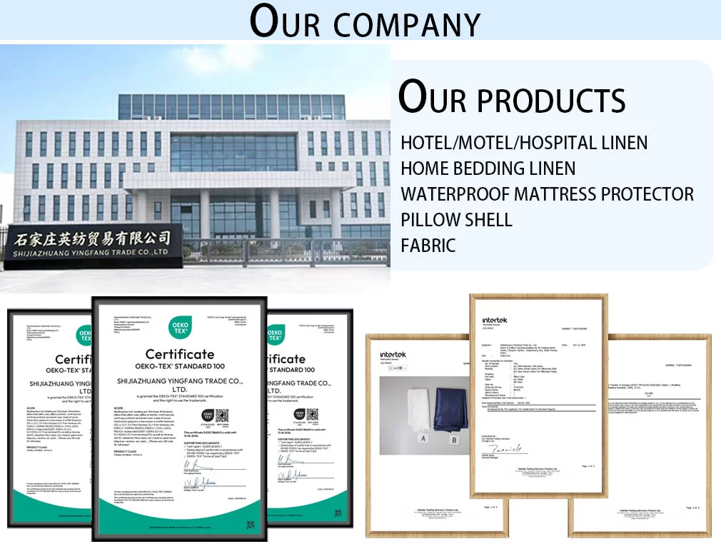 우리 SHIJIAZHUANG YINGFANG TRADE CO.,LTD 광범위한 섬유 제품 범위에는 고품질 흰색 및 부가 가치세 염료 침대 시트, 장착 시트 및 베갯잇, 퀼트, 흰색 새틴 줄무늬 및 인쇄 이불 커버, 담요, 베개, 방수 매트리스 및 베개 보호 장치, 누비 매트리스 패드, 매트리스 토퍼, 방수 빈대 매트리스 넣기, 베개 껍질, 커버, 앞치마, 액세서리 등 주로 병원, 호텔에 사용됩니다. , 그리고 집.